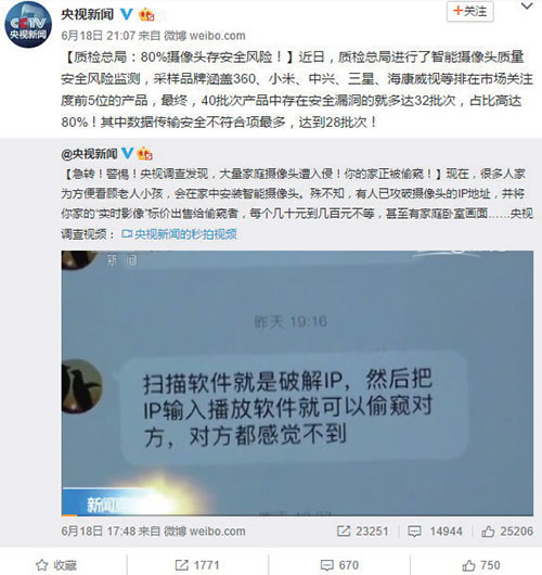 6月18日,央视新闻曝光大量家用摄像头遭入侵