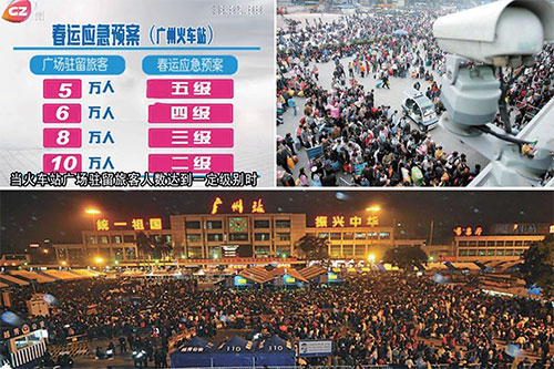 广州火车站为全国春运历年发送旅客最多的车站。仅1 月16 日,发送旅客约135 万人次。预计2017 年春运的40 天时间里广铁集团将发送旅客4705 万人。车站广场区域呈现人流量大、人员走动无规则,室外光照复杂和夜间灯光环境多变,多个出口并发人流大等特征,视频监控前端图像采集质量和后端智能分析服务能力迎来严苛考验。广州是全球智能分析服务器“昆仑”首秀,亚盈于2016 年10 月发布展示,2 个月后部署成熟实战。昆仑是亚盈『安防机器视觉』战略的产品落地,前端摄像机搭配后端CPU+GPU 集群处理,相对于纯前端智能摄像机的方案,在安装标准苛刻、复杂环境应用下拥有更高的识别率。