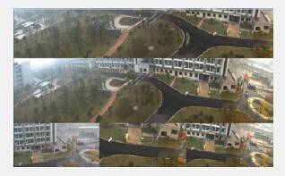上图中间的宿舍区小广场的全景画面就是由下面三副1080P 的图像拼接而成:由于是三幅1080P@25fps 的图像拼接,则全景的实际分辨率可以达到5760×1080@25fps,即620 万像素,远高于大部分全景摄像机的300 万像素,特别是由于25fps 全帧活动画面的拼接,画面流畅度可以保证全画幅25fps 的全帧活动画面,而不是某些全景摄像机的2048×1536@20fps 或者4096×1536@8fps。那么在电子变焦实现局部放大ePTZ 的时候,可以获取更接近D1@25fps 的效果,第一幅拼接大图的上下两排即为ePTZ 的效果。若再配合使用一台高清快速球机,使球机的云镜控制和全景画面联动配合,即全景画面上点击哪里,球机就快速聚