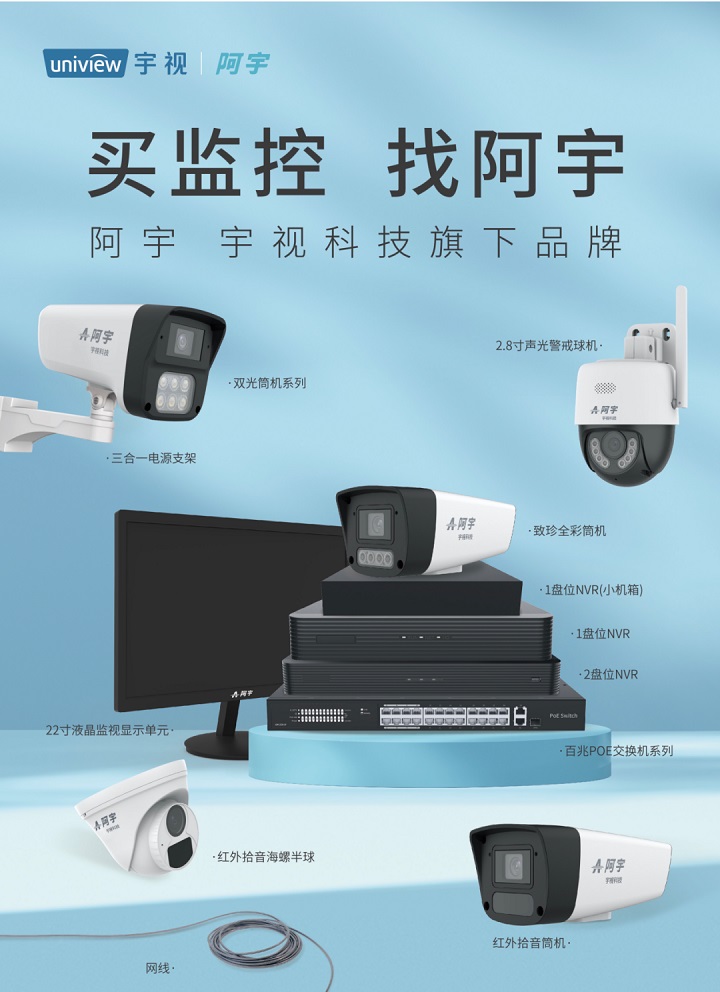 主要集中在IPC、NVR、支架、交换机和网线五大类,例如阿宇智能云台摄像机、阿宇22/43寸监视器、阿宇致珍全彩筒机、阿宇守护者系列2.8寸小球机、阿宇300万双光警戒筒机、阿宇1盘位系列NVR、阿宇百兆低功率交换机等。