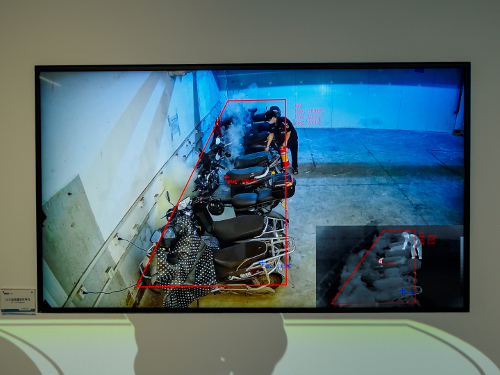 另一块显示屏上,一排正在地库充电的电动自行车被框在一个虚拟的绿色线框中,屏幕上显示着实时温度。有一辆车的电瓶位置温度逐渐升高,超过60℃后,线框变成了红色,同时系统向消控室发出了警报。在车子刚开始冒烟时,保安提着灭火器赶到,一场火灾被及时制止。