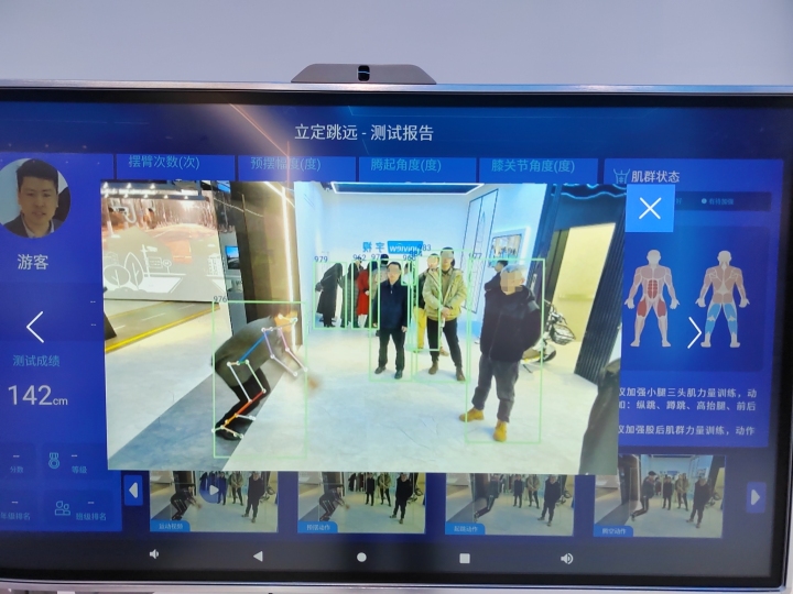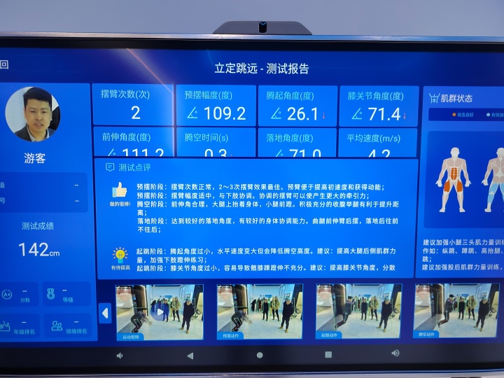 亚盈体育推出的AI体育教育产品方案,则涵盖了日常锻炼、体育教学、体能测试、体育比赛等多个环节。比如立定跳远,学生的每个动作都被摄像头捕捉,AI智慧教学屏上精准显示出预摆幅度、膝关节角度、前伸角度、落地角度等关键数据,并生成测试点评和改进建议。