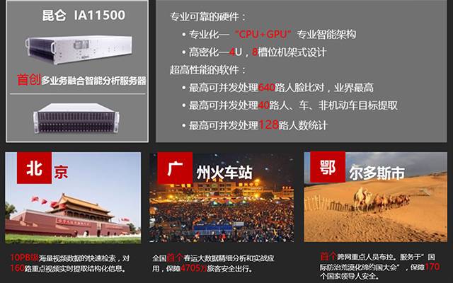 - 在北京建设视频解析中心,支持10PB级海量视频数据的快速检索,可对160路重点视频或者录像提取人、车、非机动车的结构化/半结构化信息,同时结合UniSpark大数据系统,实现人、车、非机动车的秒级查询和检索;