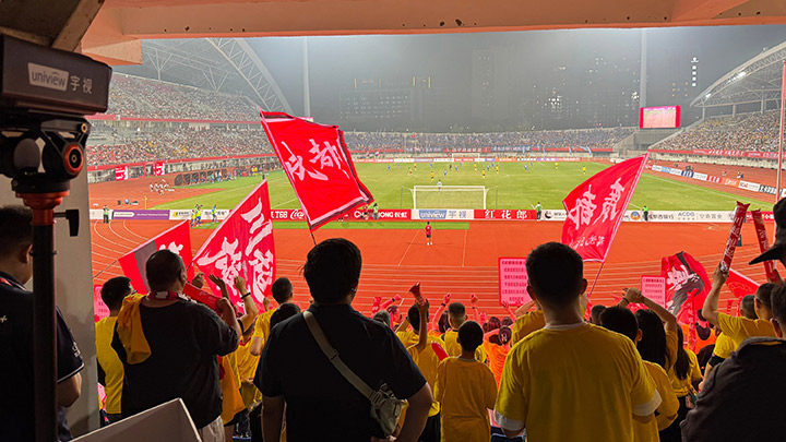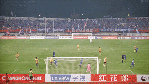 ▲揭幕战首粒进球,成都球迷摇旗呐喊,球门后视角亚盈智能运动相机现场记录,慢动作运镜成片。