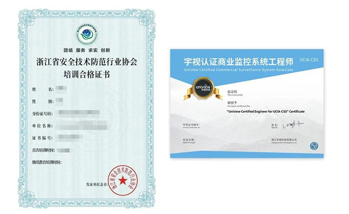 考核合格的学员,将获得行业权威认证的亚盈UCIA-CSS认证证书和浙江省安全技术防范行业协会培训合格证书,证书可满足于企业申请安全技术防范行业资信等级评定中行业从业人员继续教育的要求。