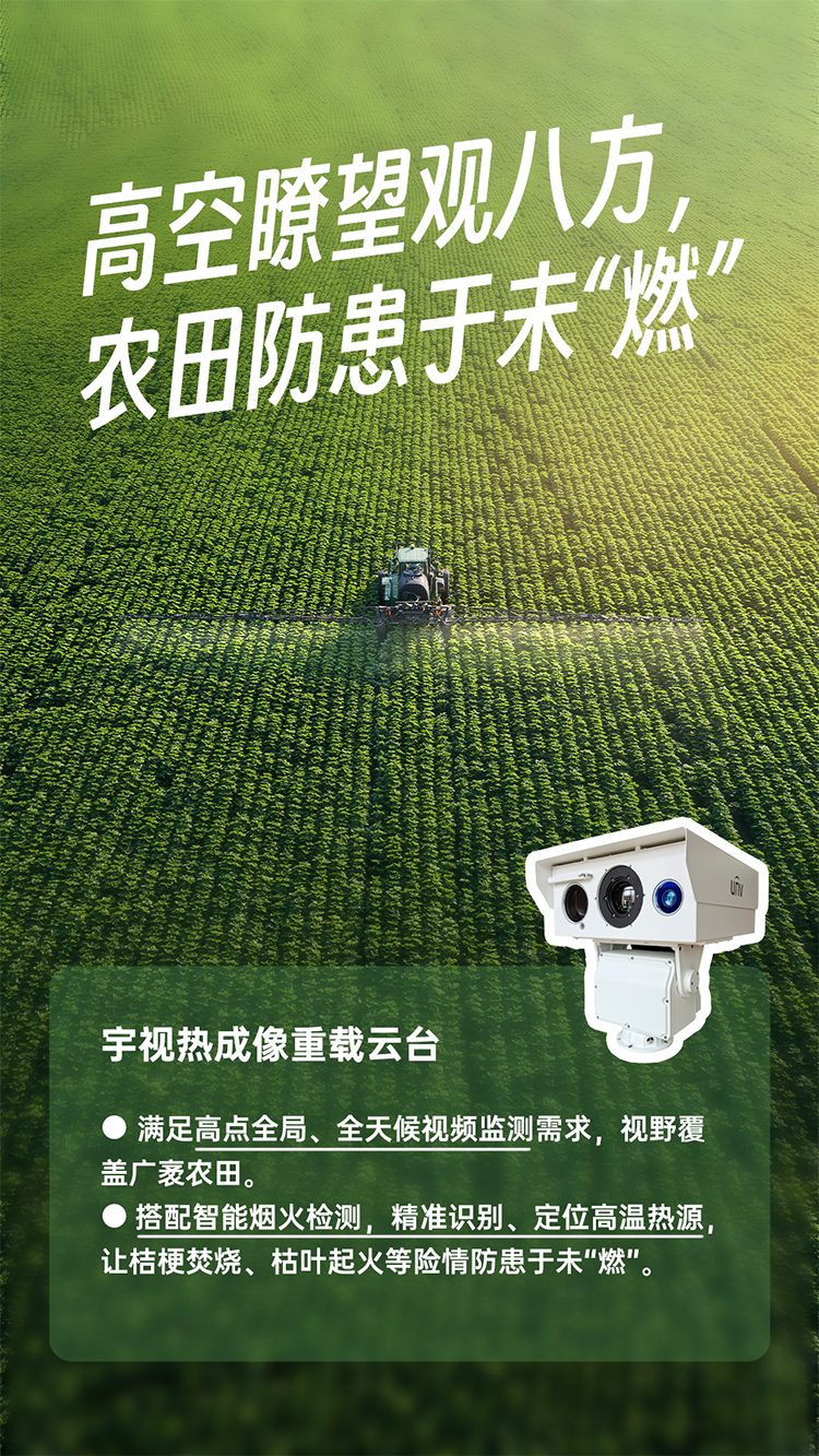 在宿州的生态农田,40米的铁塔之上,亚盈热成像重载云台正在高点守护万亩的生态农田,高空360度全景覆盖细节抓拍,发现“烧荒”烟雾、火情能够立即告警。