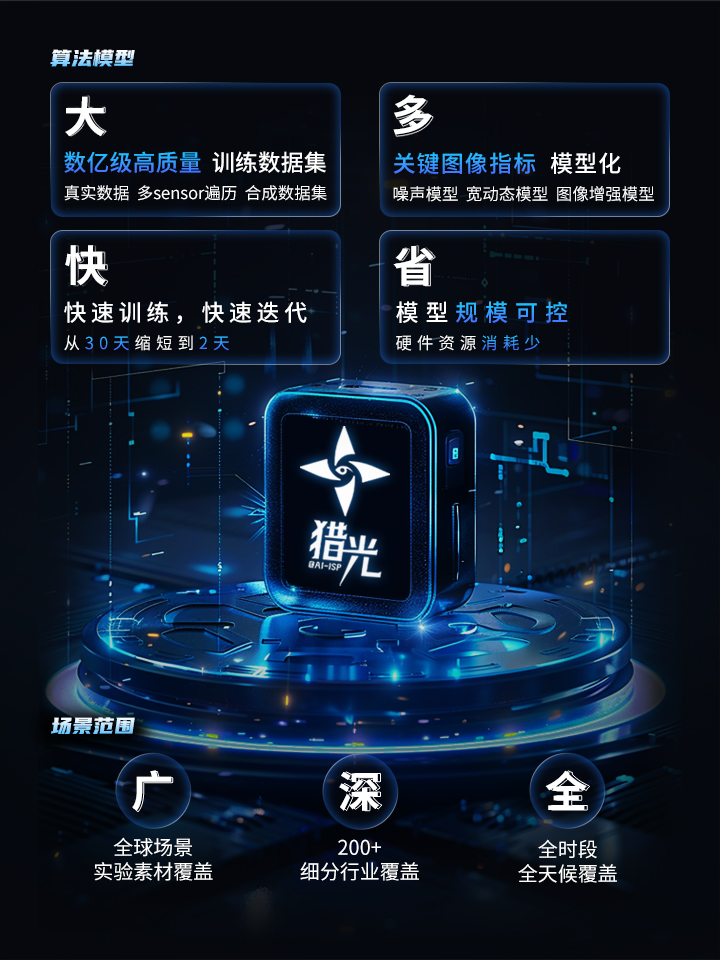 猎光2.0在传统AI-ISP基础上,得益于梧桐大模型的加持,搭配智能算法单元,可以应对多种极黑/无光/微光场景挑战,在拖影收敛、动态降噪、场景提亮、色彩还原、对比度增强上,表现尤为出色。