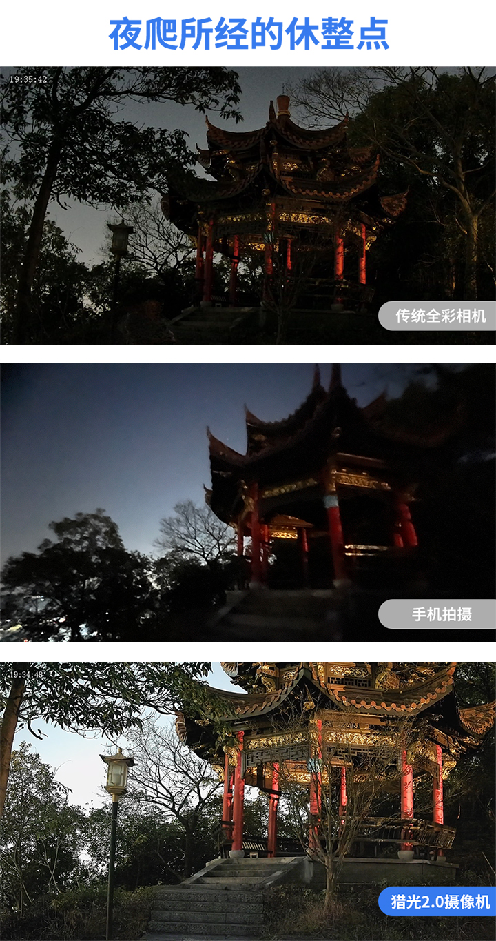这是一场极限挑战,远离城市灯光的亭台和山顶、没有任何补光伸手不见五指的山间小道,我们尝试在这样的环境下试一试猎光2.0摄像机的极限: