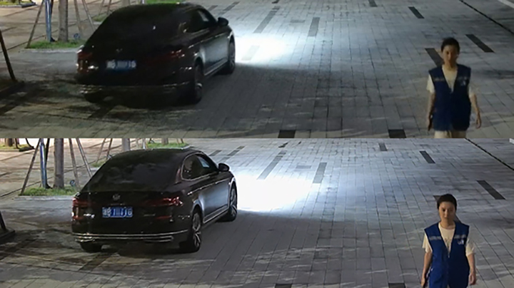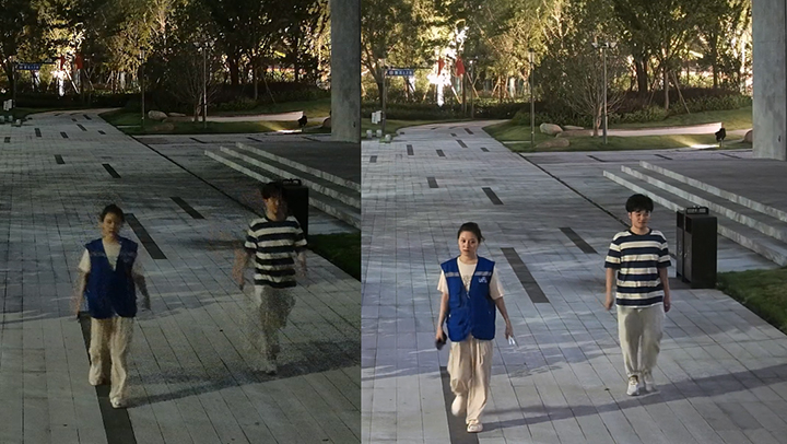 以园区、乡村为例,这一类场景的特点是夜晚只有微弱的环境光。在现有技术条件下,运动物体往往容易出现拖影,使画面细节大打折扣。
