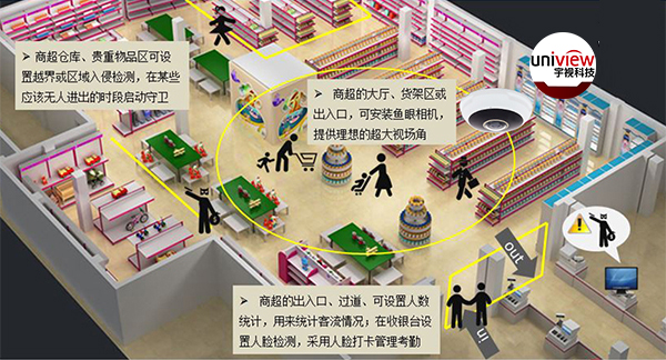 - 货架走廊:智能筒/半球/鱼眼,物品防盗监控,热区分析。